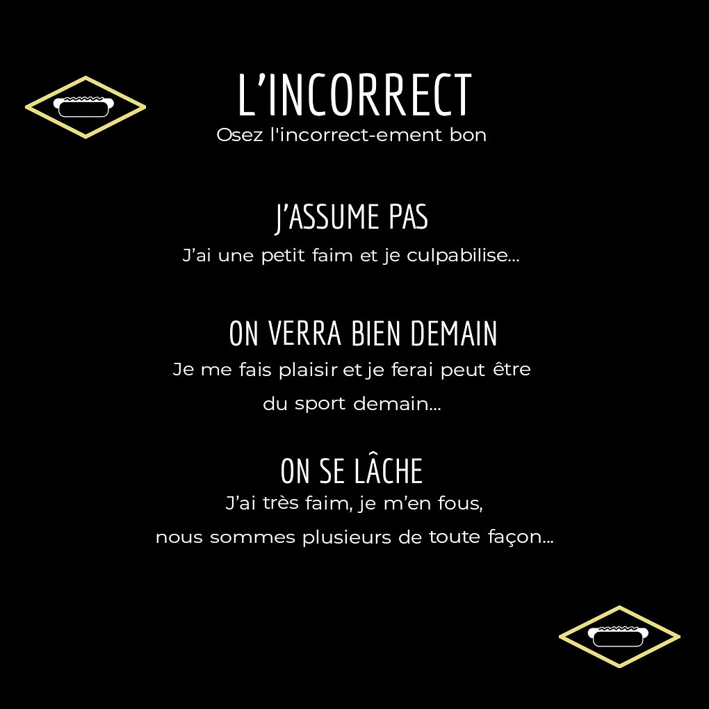 J'adore ces hot-dogs ! Il est rare de trouver une saucisse végétarienne vraiment délicieuse – bravo à l’incorrect pour cela ! L'« incrustation » change selon les saisons. La version hivernale avec raclette était un parfait mélange de tradition américaine et française. J'ai essayé l'incontournable hier soir. Je recommande vraiment l'avocat, cela m'a rappelé les hot-dogs d'Amérique latine. Ils sont de taille généreuse et se marient parfaitement avec les chips Tyrells. La ginger beer est une belle alternative sans alcool que j'ai bu avant ma Bud :) 5 étoiles d'un Australien très heureux en France ! (De plus, mes amis non végétariens ont adoré la saucisse de poulet et la salade de chou maison.)